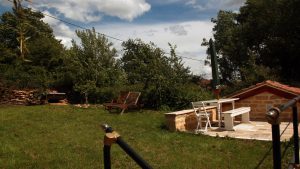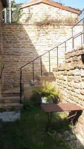 Achter het huis is de cour (27 m2) ideaal voor ontbijt in de ochtendzon uit de wind en met volledige privacy. Op een hoger gedeelte is de tuin (170m2)- rondom zon- met betegeld terras, een hout gestookt ligbad en een buitendouche. Er is tuinmeubilair aanwezig en een eettafel zodat er ook buiten gegeten kan worden .
